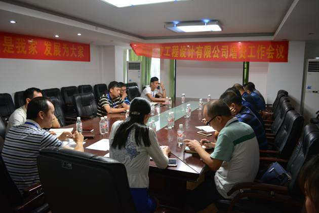 集團于2015年8月5日在南寧總部會議室召開集團設(shè)計公司增資工作會議。出席會議的有集團鄧安杰董事長、集團羅程常務(wù)副董事長、集團黃樹威副董事長、集團韋霖副總裁兼設(shè)計公司總經(jīng)理、設(shè)計公司全體股東,會議由集團羅程常務(wù)副董事長主持。