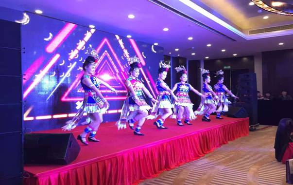 圖四:美麗的苗家姑娘載歌載舞,與各位嘉賓、領導互動,晚會現(xiàn)場充滿喜慶與歡樂。