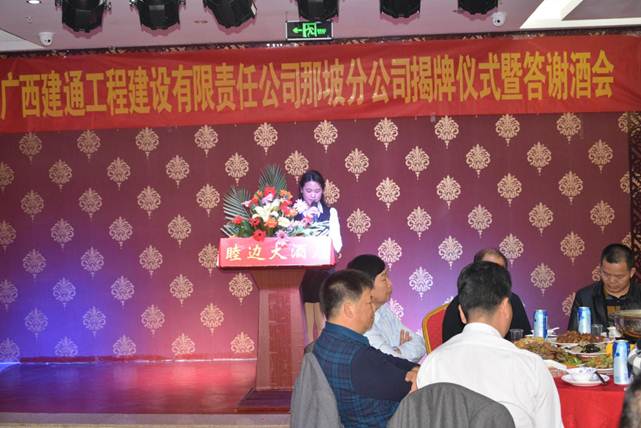 在慶典晚宴上,首先由廣西建通工程建設(shè)有限責(zé)任公司那坡分公司總經(jīng)理王曉玲發(fā)表致辭,她說:“德建志遠(yuǎn),業(yè)通人和”是我們集團最新提出的發(fā)展口號,廣西建通投資集團是一個朝氣蓬勃,充滿活力,富有想象力和創(chuàng)造力的企業(yè),集團培養(yǎng)了我們誠信的為人之道,求實的工作作風(fēng)。分公司將致力加強對員工道德品質(zhì)的培養(yǎng),加強對員工專業(yè)能力、服務(wù)質(zhì)量的把控,發(fā)揚團隊精神,為集團品牌建設(shè)及戰(zhàn)略發(fā)展目標(biāo)添磚加瓦。一如既往秉承“以質(zhì)量求信譽,以信譽求發(fā)展”的理念,為投資者和項目業(yè)主提供專業(yè)化、高水準(zhǔn)、全方位的服務(wù),以專業(yè)化的管理做強分公司、做大建通品牌為已任,抓住機遇!共同努力在建通平臺上實現(xiàn)更高的人生價值,我公司熱忱地期望能與社會各界新老朋友精誠合作、攜手共進(jìn),創(chuàng)造更加輝煌的未來。