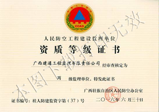 根據(jù)國(guó)家人防辦《人防工程監(jiān)理行政許可資質(zhì)管理辦法》以及《廣西壯族自治區(qū)人民防空行政審批操作規(guī)范》等有關(guān)規(guī)定,廣西建通工程監(jiān)理有限責(zé)任公司人防工程監(jiān)理丙級(jí)資質(zhì)證書(shū)在有效期屆滿(mǎn)后,及時(shí)向自治區(qū)人防主管部門(mén)提交資質(zhì)延續(xù)申請(qǐng)材料,并于2016年6月30日成功獲得新頒發(fā)的人防工程監(jiān)理丙級(jí)資質(zhì)證書(shū)。該資質(zhì)業(yè)務(wù)范圍為:本行政區(qū)域內(nèi)抗力等級(jí)6級(jí)、6B級(jí)及建筑面積1萬(wàn)平方米以下的人防工程監(jiān)理業(yè)務(wù), 證書(shū)有效期至2017年8月30日。