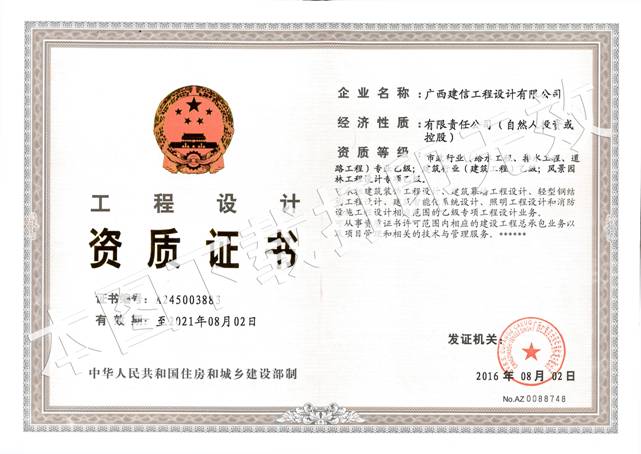 2016年08月09日,從廣西住房和城鄉(xiāng)建設(shè)廳官網(wǎng)再傳來喜訊,我集團(tuán)旗下子公司廣西建信工程設(shè)計有限公司順利通過了廣西住建廳資質(zhì)審查,成功增項風(fēng)景園林工程設(shè)計專項乙級資質(zhì)。該資質(zhì)可承攬中型以下規(guī)模風(fēng)景園林工程項目和投資額在2000萬元以下的大型風(fēng)景園林工程項目的設(shè)計?,F(xiàn)廣西建信工程設(shè)計有限公司擁有資質(zhì)為:建筑行業(yè)(建筑工程)乙級、市政行業(yè)(給水工程、排水工程、道路工程)專業(yè)乙級、風(fēng)景園林工程設(shè)計專項乙級和城鄉(xiāng)規(guī)劃編制乙級。