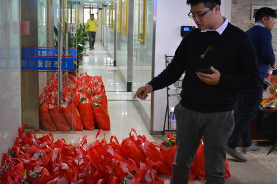 工作人員有條不紊地為同事們發(fā)放年貨