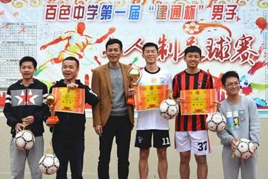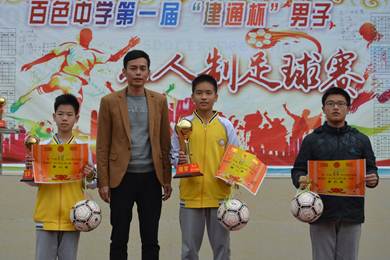 “感謝建通投資集團(tuán)捐資贊助百色中學(xué)開展足球聯(lián)賽,通過比賽,同學(xué)把團(tuán)結(jié)協(xié)作、頑強(qiáng)拼搏、勇攀高峰的競(jìng)技精神轉(zhuǎn)化為強(qiáng)大的學(xué)習(xí)動(dòng)力,達(dá)到了預(yù)期目的!”這是2017年12月26日16時(shí)30分,百色中學(xué)黃振剛副校長(zhǎng)在首屆“建通杯”校園足球聯(lián)賽閉幕致辭時(shí)說出的一番肺腑之言。建通投資集團(tuán)副董事長(zhǎng)黃樹威應(yīng)邀出席閉幕式并為獲獎(jiǎng)班級(jí)頒獎(jiǎng)。