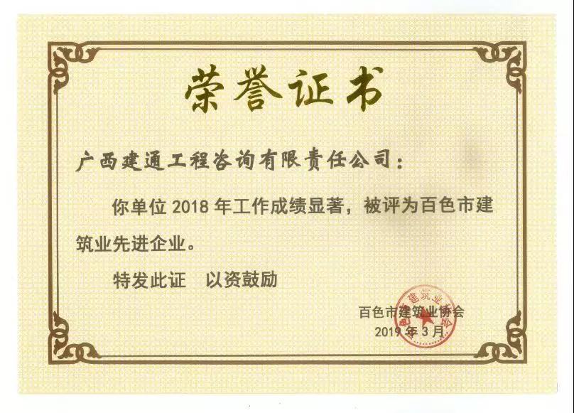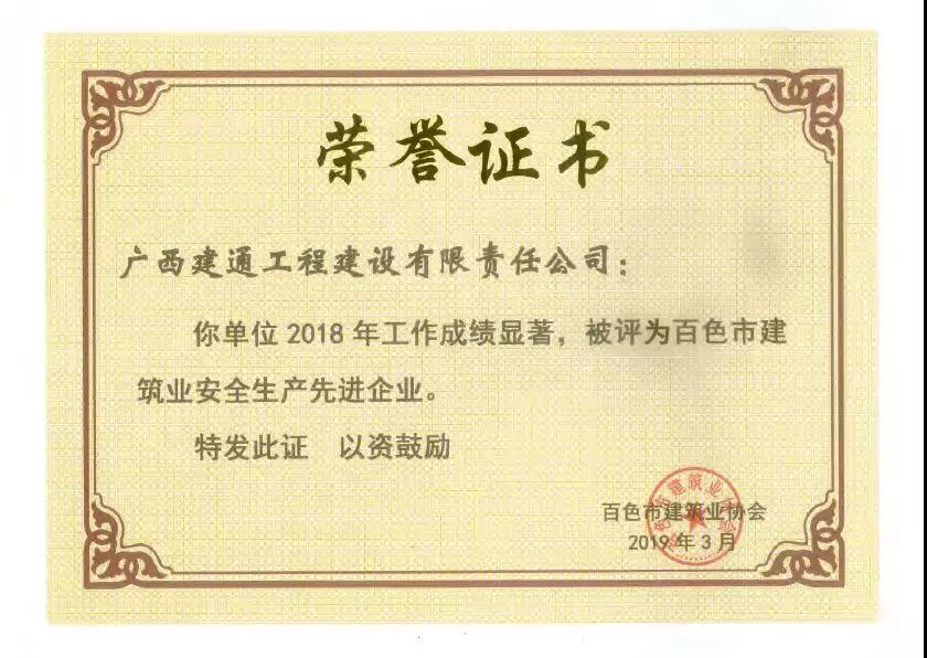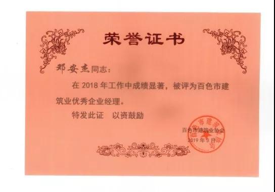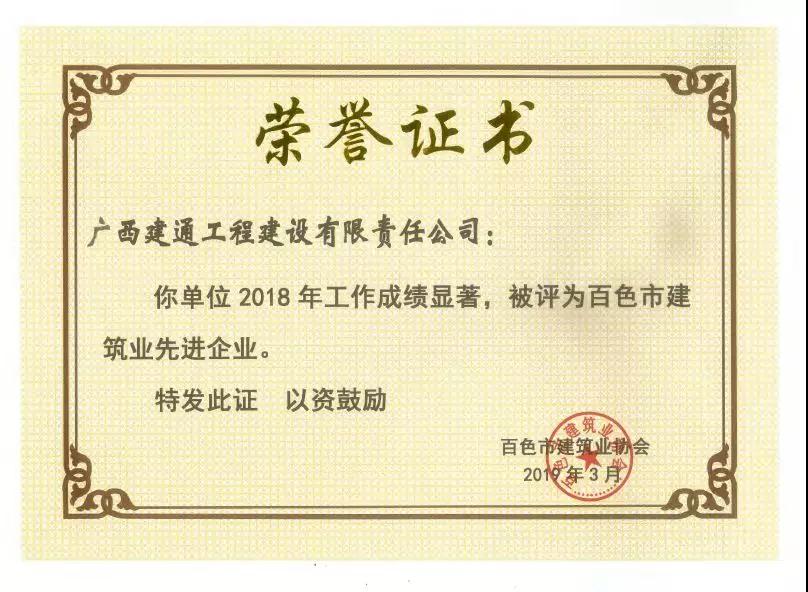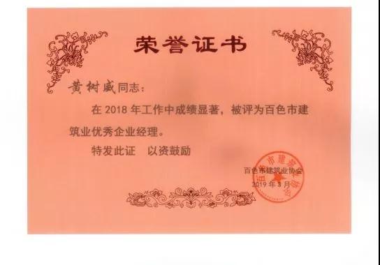 二、廣西建通工程建設(shè)有限責(zé)任公司榮獲《2018年度百色市建筑業(yè)先進(jìn)企業(yè)》、《2018年度百色市建筑業(yè)質(zhì)量管理先進(jìn)企業(yè)》、《2018年度百色市建筑業(yè)安全生產(chǎn)先進(jìn)企業(yè)》、黃樹威副董事長榮獲《2018年度百色市建筑業(yè)優(yōu)秀企業(yè)經(jīng)理》榮譽(yù)稱號;