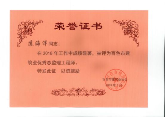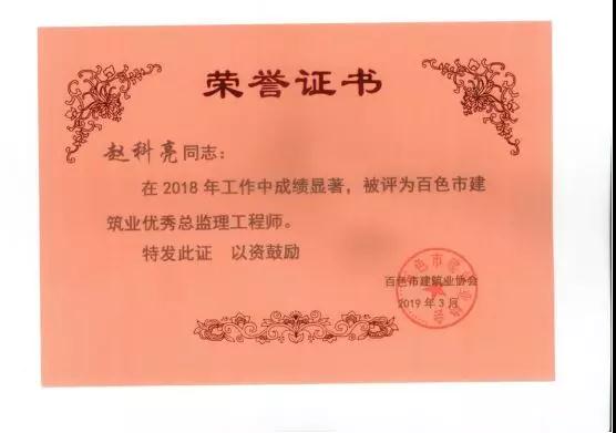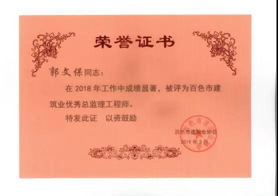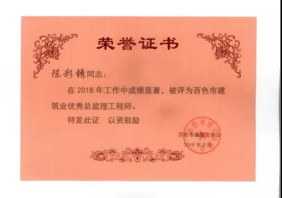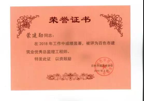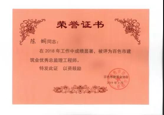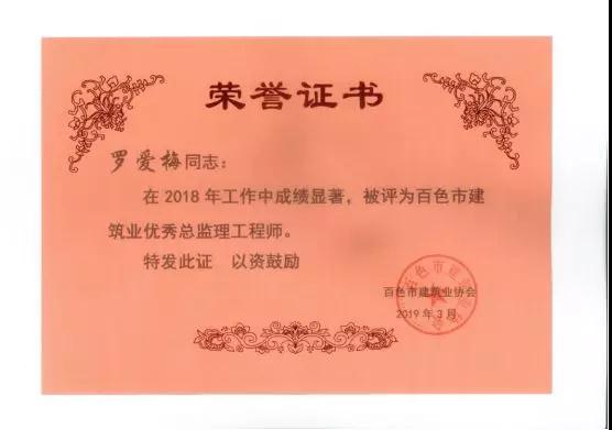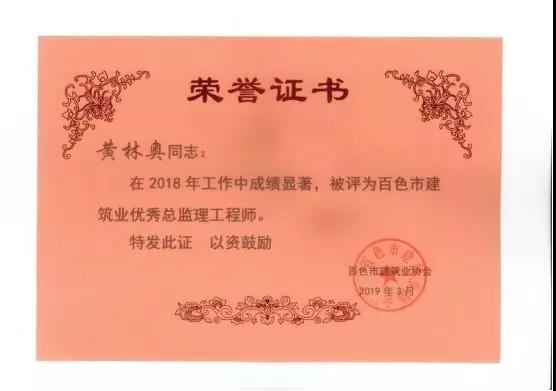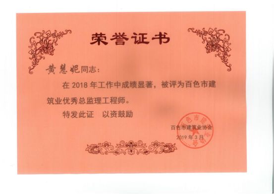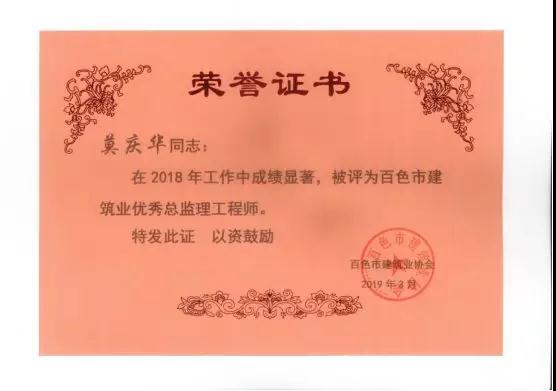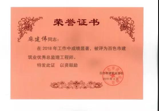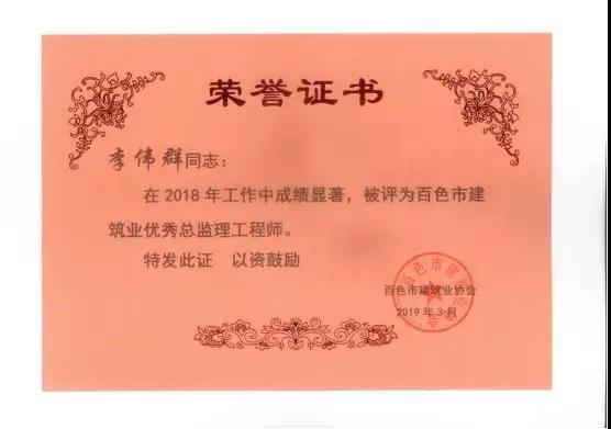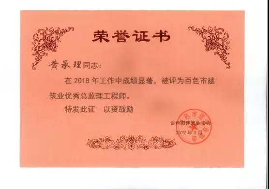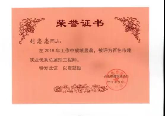 三、廣西建通工程監(jiān)理有限責(zé)任公司名下技術(shù)總監(jiān):劉忠志、蒙建勛、黃承理、趙科亮、麻建偉、盧貴修、黃慧妮、陳 垌、蘇海洋、羅愛梅、陳彩繡、黃林奧、莫慶華、李偉群、郭文保等15位榮獲《2018年度百色市優(yōu)秀總監(jiān)理工程師》榮譽(yù)稱號;