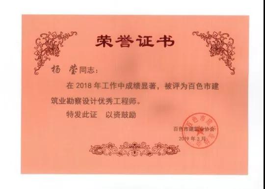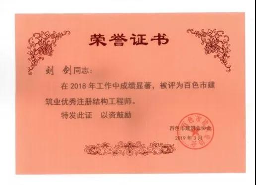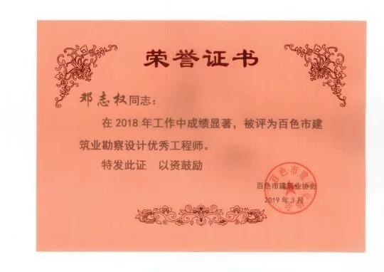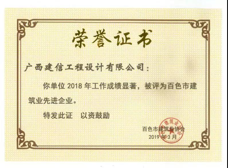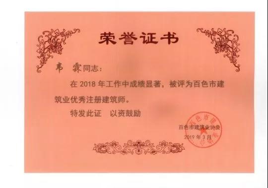 四、廣西建信工程設(shè)計有限公司榮獲《2018年度百色市建筑業(yè)先進(jìn)企業(yè)》、韋霖榮獲《2018年度百色市勘察設(shè)計優(yōu)秀注冊建筑師》、劉劍榮獲《2018年度百色市勘察設(shè)計優(yōu)秀注冊結(jié)構(gòu)師》、楊瑩、鄧志權(quán)榮獲《2018年度百色市勘察設(shè)計優(yōu)秀工程師》的榮譽(yù)稱號。
