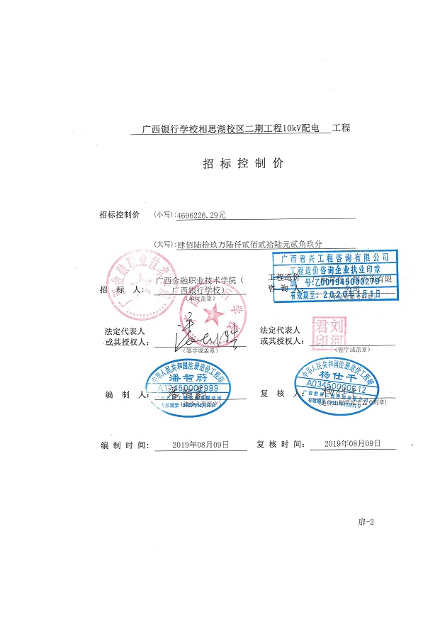 廣西銀行學(xué)校相思湖校區(qū)10KV配電工程(二期)[項目編號:項目編號:GXZC2019-G2-26009-GXJT]招標(biāo)控制價公布如下: